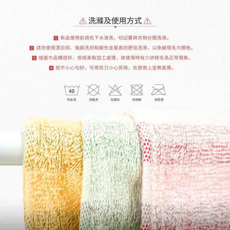 3.深色衣物建議單洗滌,以翻面手洗(勿用熱水)並建議第一次穿上前請先下水洗滌,以避免染色問題。
