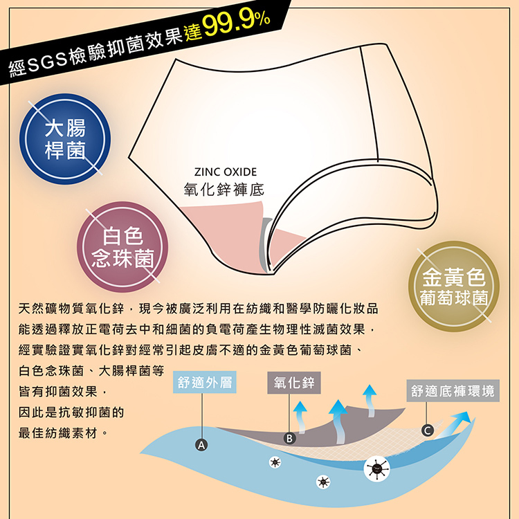 褲底內裏>嫘縈(人造棉)66.5% 聚酯纖維(氧化鋅)28.5% 彈性纖維5%